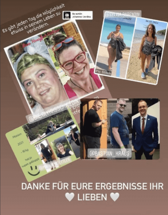Das hier sind alles echte Kunden, die ihre echte Meinung teilen. Niemand wurde in irgendeiner Form für diese Statements & Videos kompensiert! Wir können Dir keine Ergebnisse garantieren. All diese Menschen auf dieser Seite haben hart für ihren Erfolg gearbeitet und ihn sich wirklich verdient! Diese Erfolge sind i.d.R. nur möglich, wenn Du vorher 1:1 mit uns sprichst und zusammenarbeitest. Dies ist KEIN „Schnell und hektisch abnehmen“-Programm. Das hier kommt von einer richtigen Firma, mit richtigen Angestellten und echten Kunden, sowie mehreren Firmensitzen weltweit.
